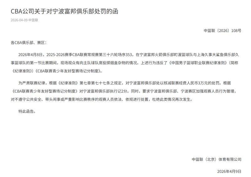 虎扑04月09日讯 今日,CBA官方发布对宁波男篮处罚的函。