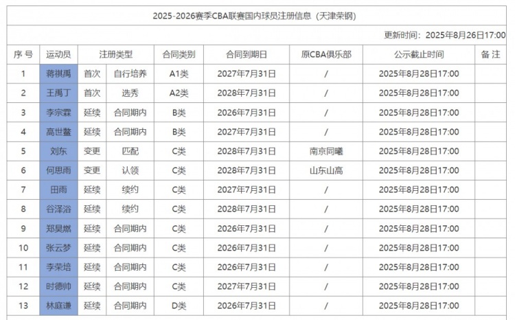 8月26日讯 CBA官网更新了天津男篮新赛季的国内球员注册信息,天津共注册了13人。